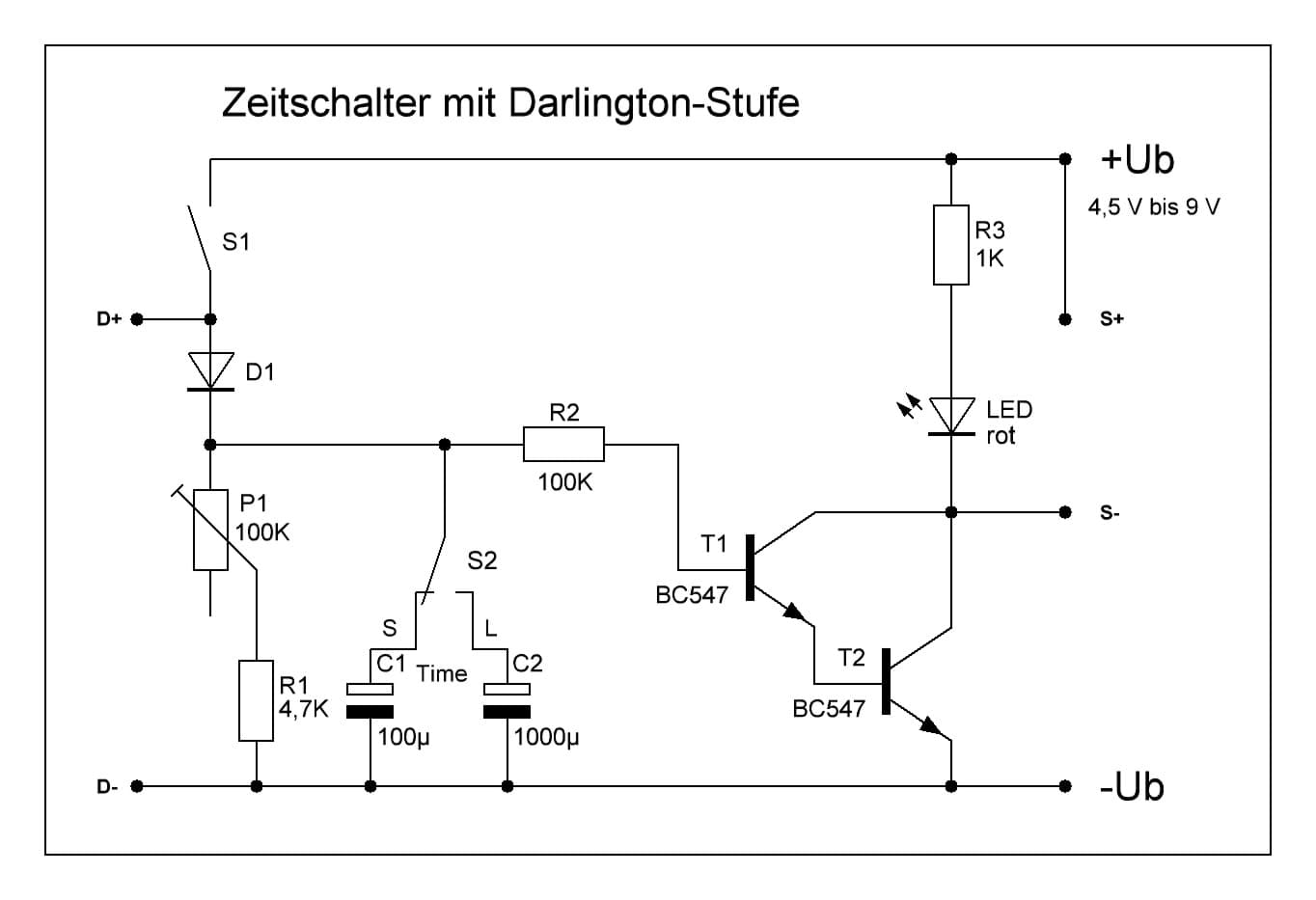 Der Zeitschalter lässt eine Leuchtdiode für die Dauer einer einstellbaren Zeit leuchten. Die Schaltung eignet sich für eine, nur kurze Zeit benötigte Funktion. Anstelle der LED kann auch ein anderer Verbraucher angeschlossen werden (Relais / Kleinlüfter etc.)